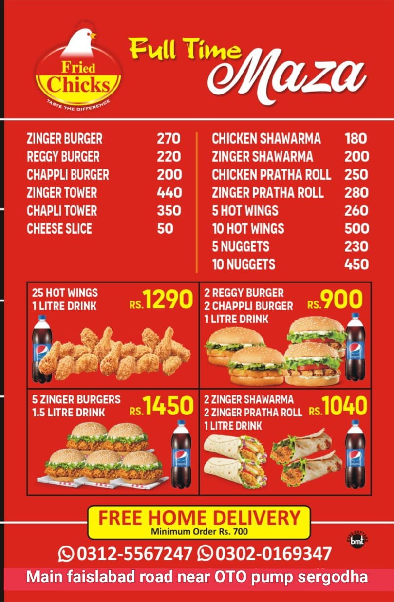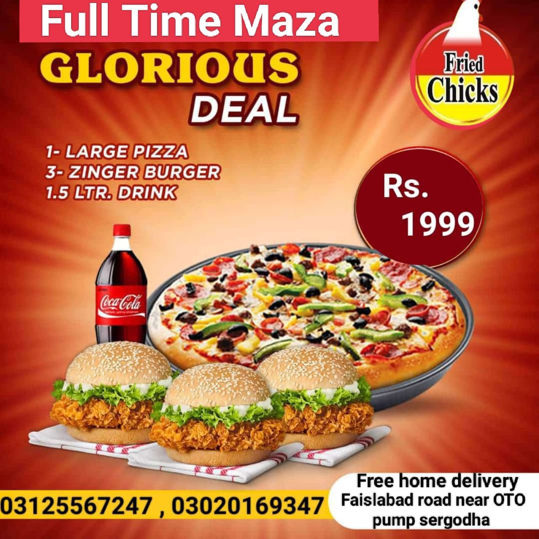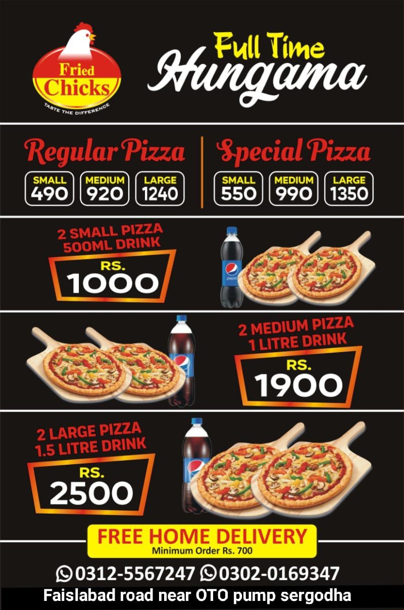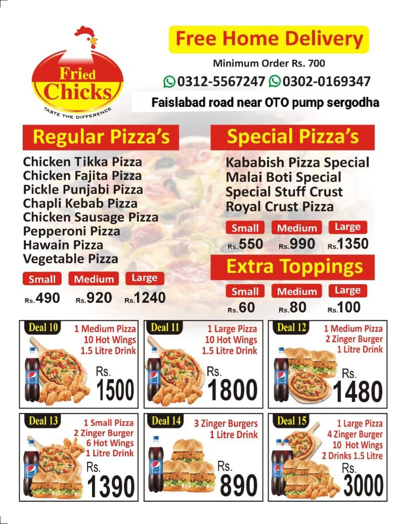Looking for delicious fast food in Sargodha? Fri Chicks Fast Food, located on Faisalabad Road, near OTO Petrol Pump, is here to satisfy your cravings! Whether you’re in search of a burger near me, a crispy zinger burger, or a piping hot pizza near me, we have a wide variety of options to choose from. Our large pizza is perfect for family meals, and we also offer great family deal pizzas for gatherings. With fresh ingredients, quick service, and convenient delivery, your favorite meals are just a call away. We ensure quality in every bite, whether you dine in, take away, or order online. Visit Fri Chicks today for the best fast food experience in town!